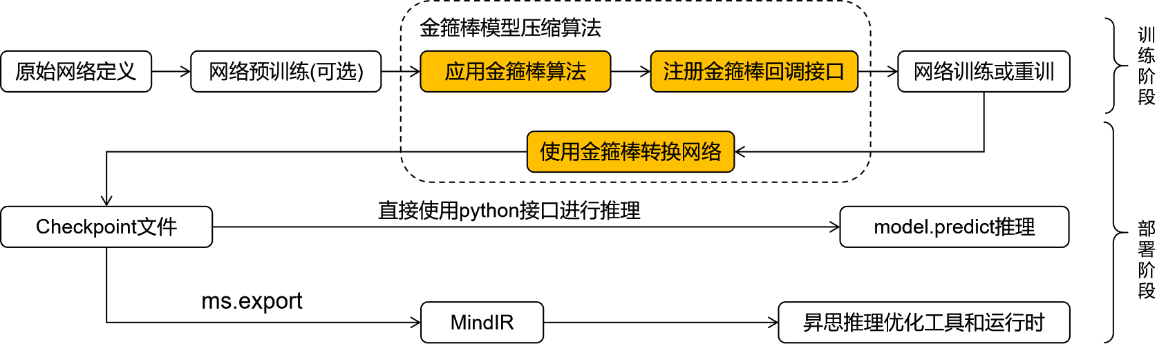 在训练网络时应用MindSpore Golden Stick算法不会对原有的训练脚本逻辑产生很大的影响,如上图中黄色部分所示,仅需要增加额外两步: