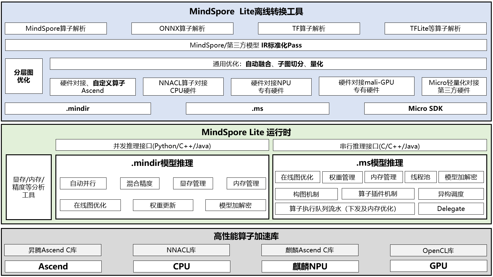 支持MindSpore/TensorFlow Lite/Caffe/Onnx模型,提供模型压缩、数据处理等能力,统一训练和推理IR,方便用户快速部署。