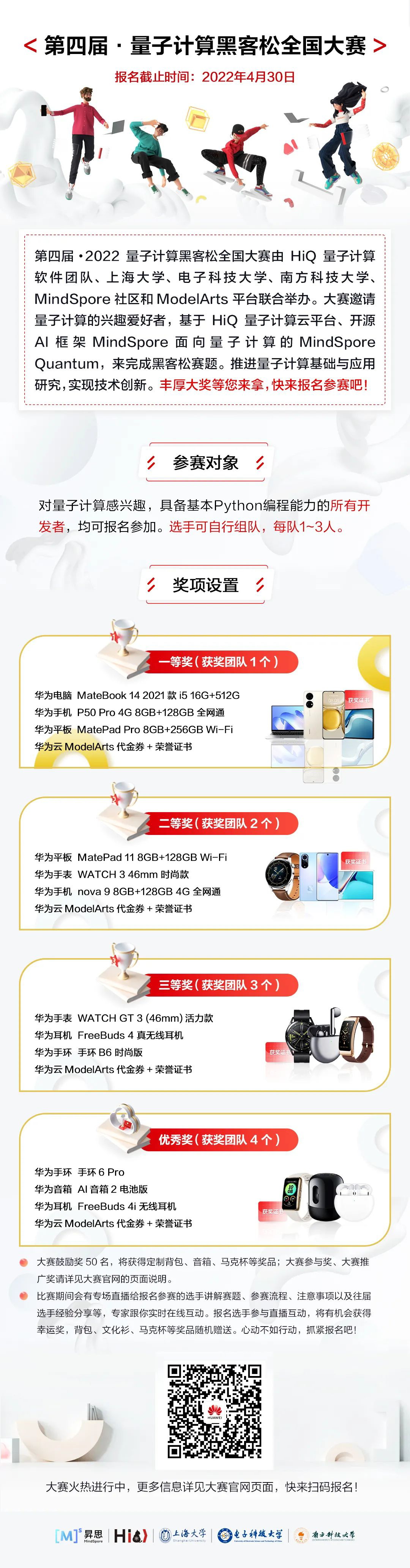 第四届·2022量子计算黑客松全国大赛由HiQ量子计算软件团队、上海大学、电子科技大学、南方科技大学、昇思MindSpore社区和华为云ModelArts平台联合举办。