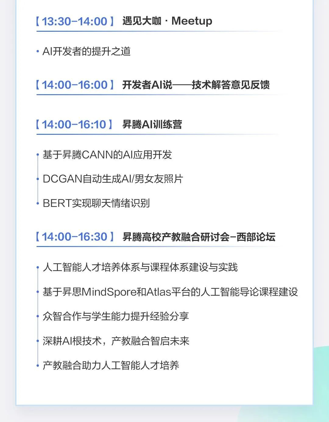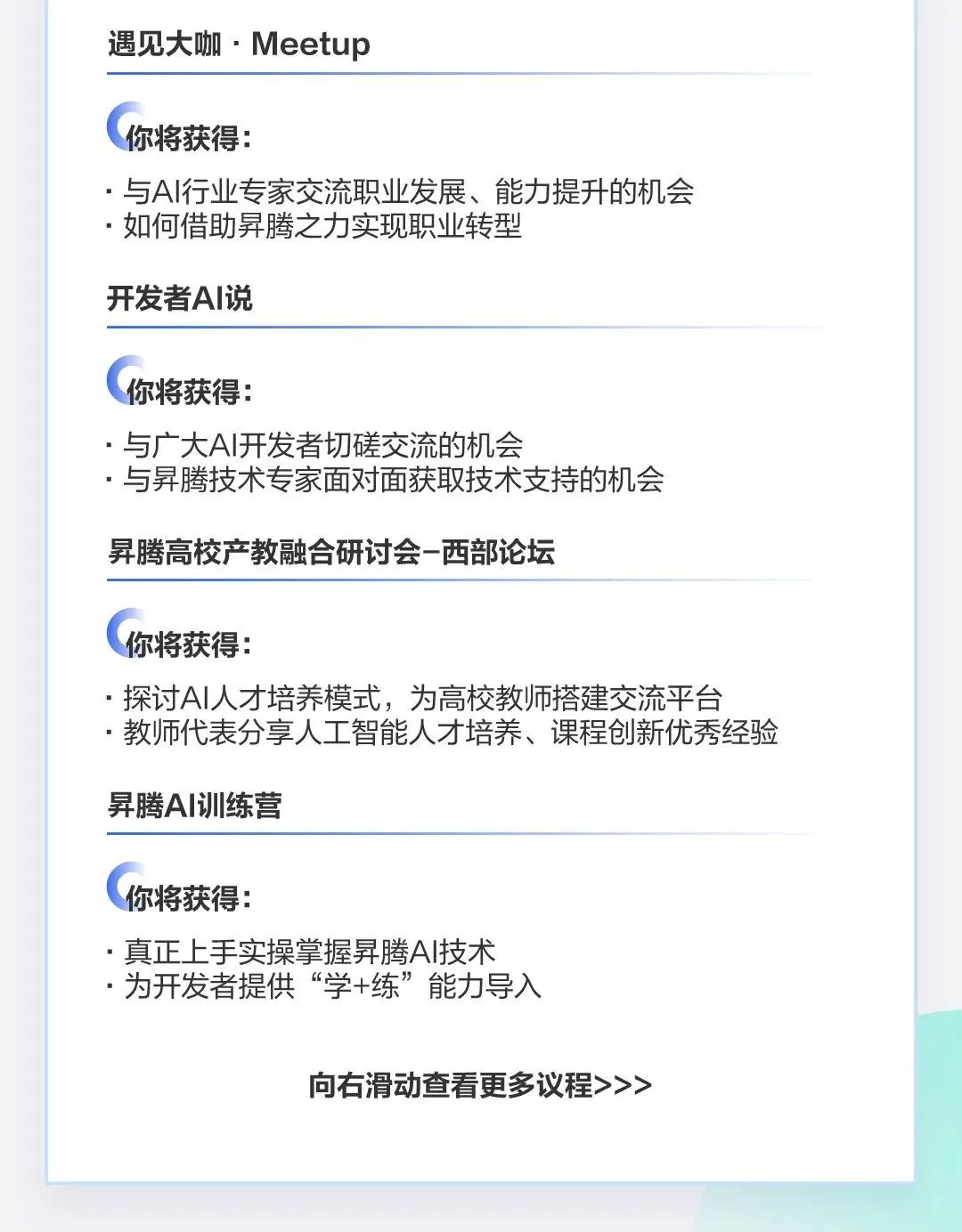 为满足开发者的不同需求,本次还有昇腾AI训练营、开发者AI说、遇见大咖等主题活动,让广大AI开发者面对面切磋交流、绽放灵感火花。