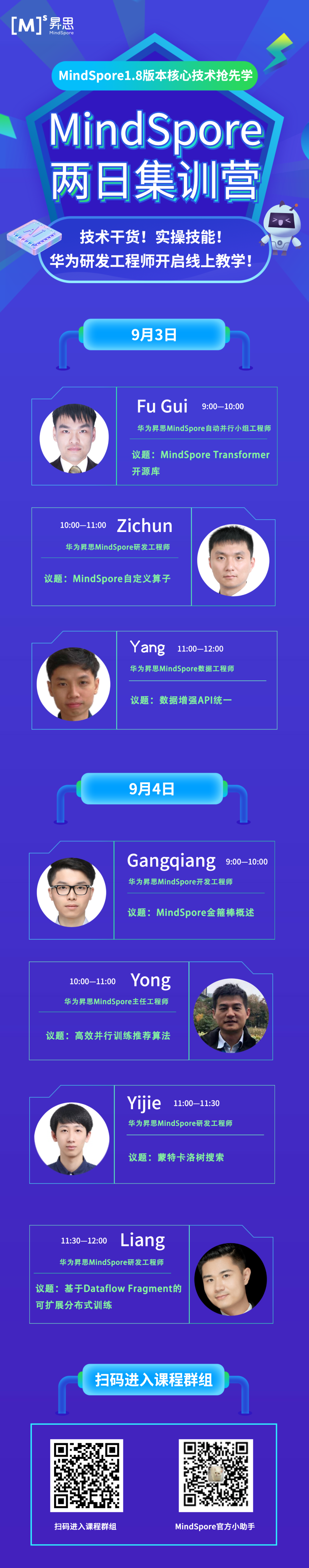 本次两日集训营,我们特邀7位MindSpore研发专家为大家线上授课,每个课题均给大家留下了作业,讲解过后,大家可以通过作业消化内容。华为研发专家将会全程社群指导,开发者避“坑”经验等你get!