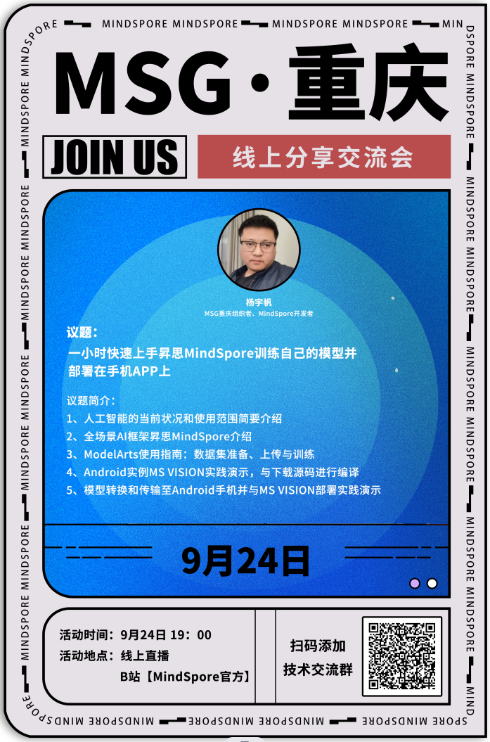 9月24日,MSG重庆开启线上分享交流会。本次活动,我们将带领大家如何一小时快速上手昇思MindSpore训练自己的模型并部署在手机APP上。与大家一起体验与交流昇思MindSpore易用性。