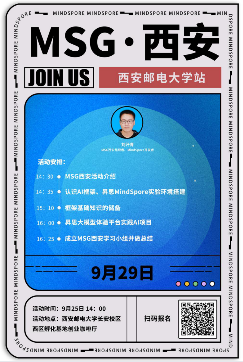 9月29日,MSG西安将走进西安邮电大学。本次活动,我们将从认识AI框架出发,介绍并搭建昇思MindSpore实验环境,手把手带你在昇思MindSpore环境中学习、掌握有关神经网络的基础知识,最后带领大家体验昇思大模型体验平台,实践手写数字识别、图像分类的AI项目。