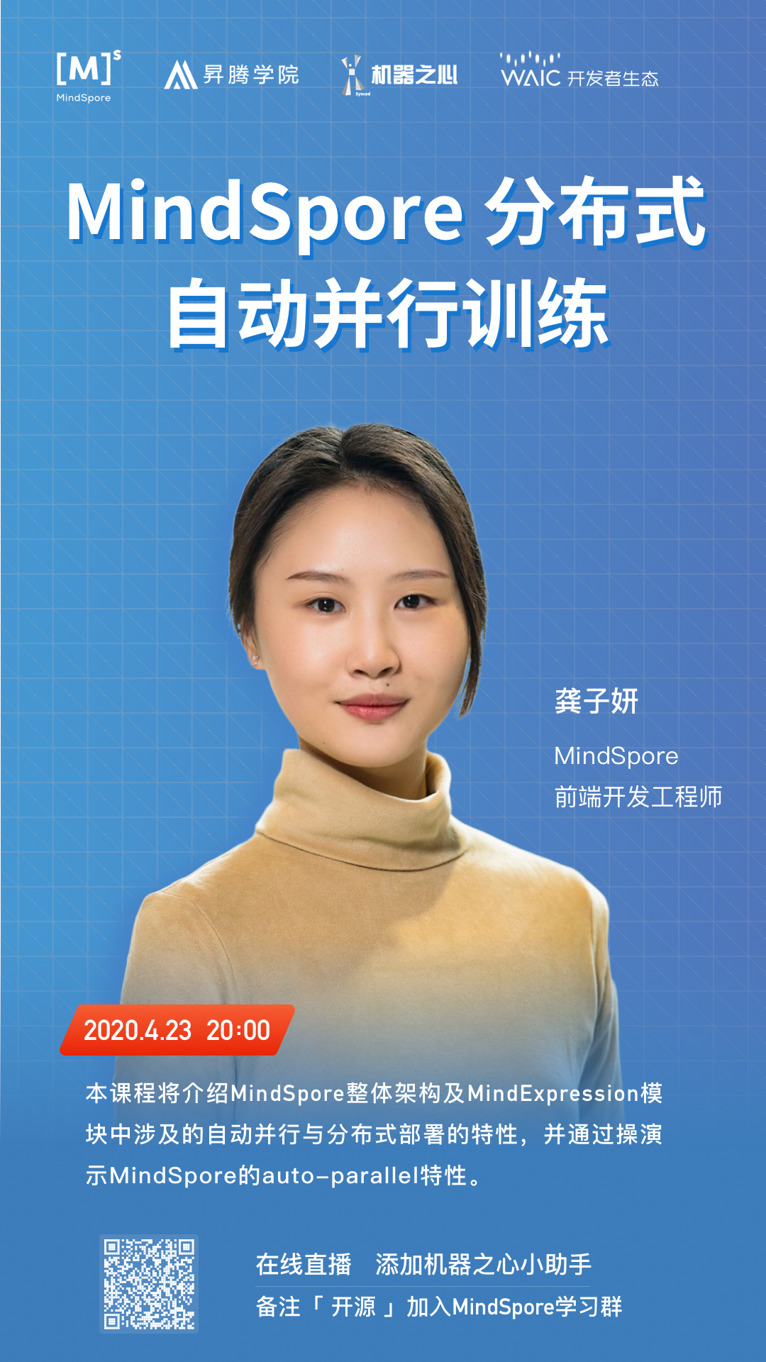 4 月 23 日,机器之心联合华为昇腾学院开设的线上公开课**《轻松上手开源框架 MindSpore》**第一课正式开讲,MindSpore 前端开发工程师龚子妍为大家带来了主题分享《MindSpore 分布式自动并行训练》,第一课回顾视频如下
