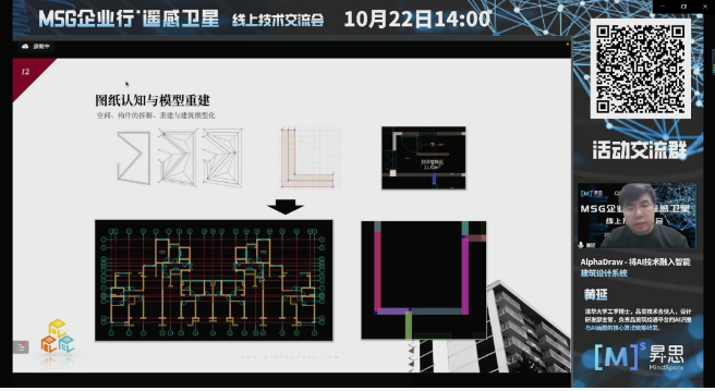 品览技术合伙人兼设计研发部主管黄延:介绍了品览推出的施工图自动绘制平台筑绘通的整体实现架构,并就其主体流程中的 AI 自动识图和 AI 自动画图的基本原理进行了介绍。处理这些问题需要涉及到利用人工智能方法、计算几何方法以及运筹优化方法到对空间拓扑与空间结合结构的特征进行深入分析,这些方法论与遥感领域的分析方法论有相似之处,可供互相参考,融会贯通。