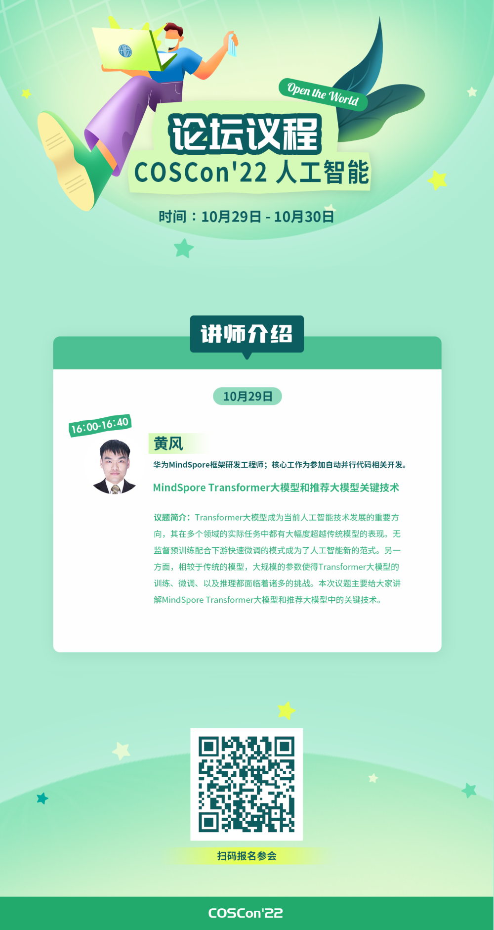 10月29日16:00,昇思MindSpore研发工程师黄风将在人工智能分论坛为大家分享MindSpore Transformer****大模型和推荐大模型中的关键技术。