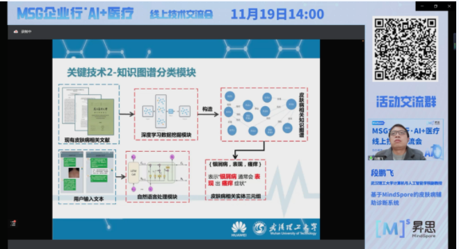 武汉理工大学计算机与人工智能学院副教授段鹏飞:基于国产化MindSpore深度学习平台,以快捷轻便的皮肤病诊断为研究重点深入挖掘,运用团队所研究的小样本分类、自然语言处理和知识图谱技术,分享了基于MindSpore的轻量级移动平台皮肤病辅助诊断系统。