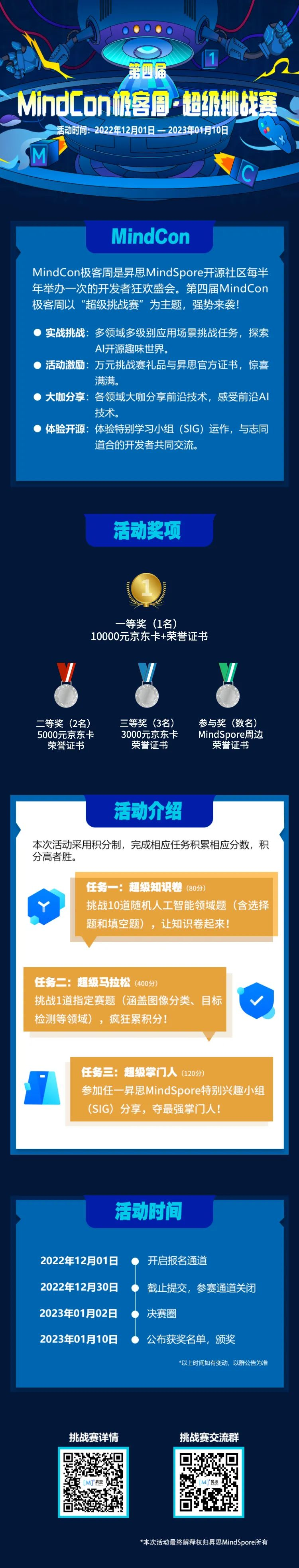 由昇思MindSpore开源社区每半年举办一次的MindCon极客周开发者狂欢盛会如约而至。第四届MindCon极客周以**“超级挑战赛”**为主题,发布三大硬核任务等你来战!与MindSpore一起参与挑战、体验开源!