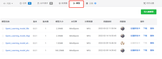 保存完后,页面将自动跳转至模型页面,刚保存的模型也自动列入进来了。