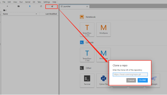 点击图标,输入代码仓地址进行克隆,也可以新建一个terminal文件输入git clone + 代码仓地址。