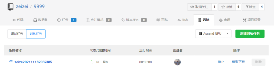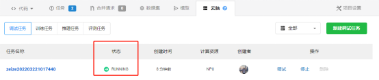 点击新建任务后,待状态由INIT变更为RUNNING后(由于需要申请算力资源,此过程可能会持续一定时间,稍候即可),项目将开始启动训练。