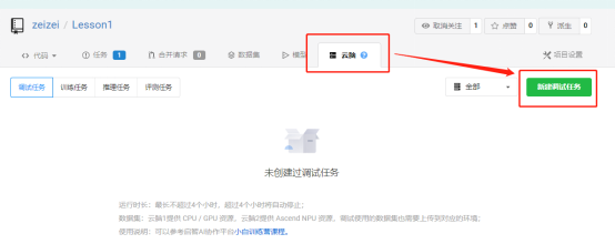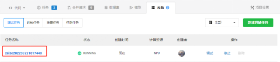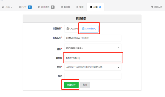 在新建任务的页面中,计算资源选择【Ascend NPU】,数据集选择该项目调试相关的数据集,然后点击【新建任务】完成创建。