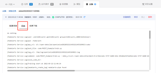 点击配置信息旁边选项【日志】可以查看相关训练日志,尤其当训练任务失败时,状态会显示为“FAILED”,此时我们可以通过查询日志了解训练失败的原因。