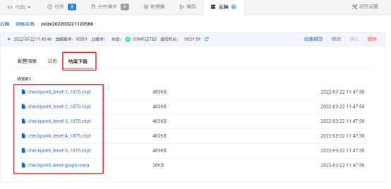 如果想要下载训练完毕模型的checkpoint,方便日后加载模型进行预测或者是迁移训练。则需要点击【结果下载】,可以查看训练出的模型,点击模型名称可直接下载。