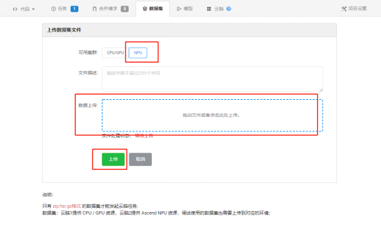 进入上传页面,选择云脑2 的 NPU 集群,然后将数据集直接拖入或点击上传,最后点击【上传】按钮。