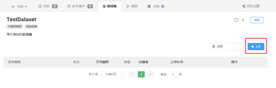要使用云脑,需先上传数据集,我们先进入【数据集】页面,点击右侧【上传】按钮。