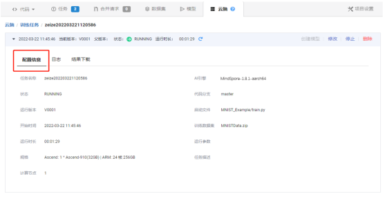 点击任务名称,进入到版本管理页面,默认查看配置信息,比如任务运行时长及状态,还有相关参数信息等。训练时长无限制,所以大家放心大胆地使用~