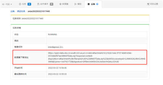 进入到任务详情页面后,我们可以看到数据集下载地址,将它复制一下吧,后续就可以在运行环境中粘贴下载了。