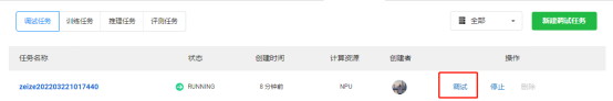 待任务状态变为RUNNING后,点击操作栏的【调试】。