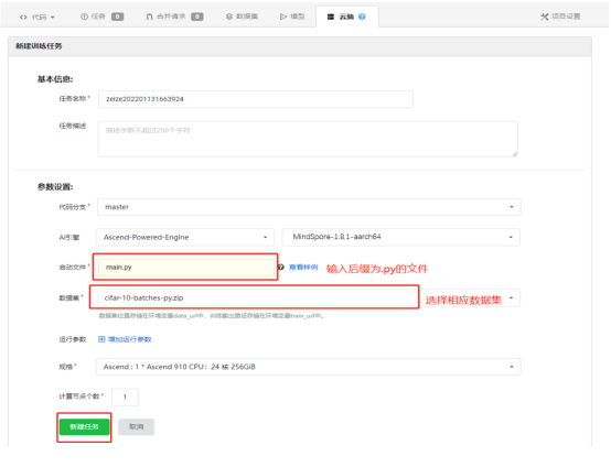点击右侧【新建训练任务】,进入任务创建页面,其中【启动文件】和【数据集】为必填项,需选择该项目相关的文件,且启动文件必须为.py格式的文件(可以点击右侧的查看样例了解如何进行模型训练的详情),所以需先上传代码文件,因前面已经上传过数据集,此处也不再赘述,其他选项默认即可。