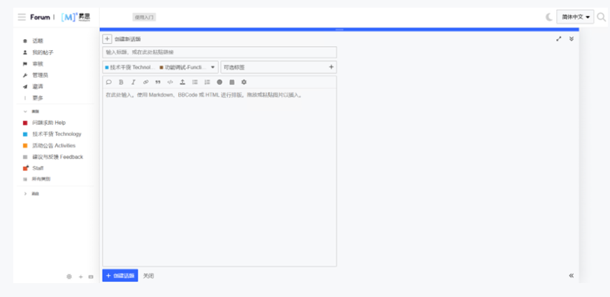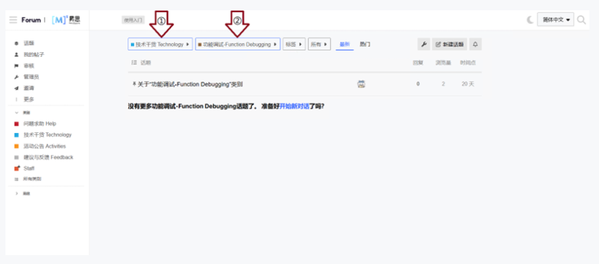 点击页面右上角新建话题进入发布帖子页面,首先填入标题并选择“技术干货 Technology→功能调试 Function Debugging”类别,也可根据帖子内容选择对应标签,将正文内容编辑完毕点击“创建话题”即可完成发帖!!!