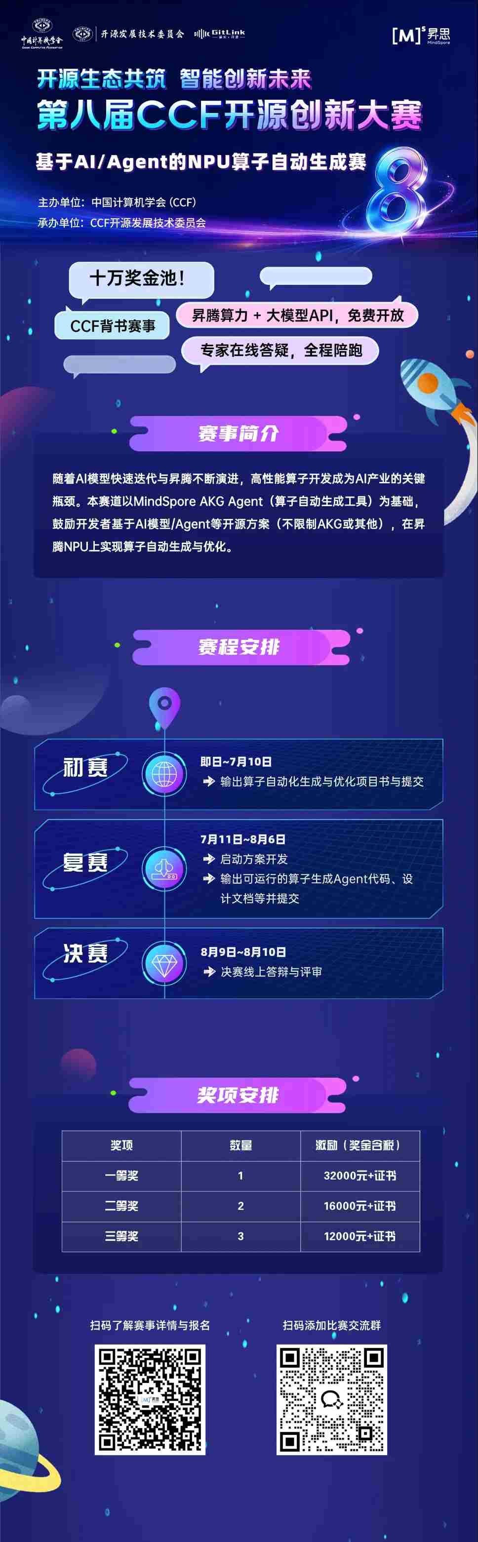 立足数字经济深度发展与国家开源战略布局,面向人工智能、泛在操作系统领域的技术创新、成果转化与专业人才供给需求,第八届 CCF 开源创新大赛由中国计算机学会(CCF)主办,CCF开源发展技术委员会承办。 本届大赛中,昇思MindSpore开源社区发起“基于AI/Agent的NPU算子自动生成赛”,诚邀广大开发者共同探索智能算子的前沿实践,欢迎踊跃报名!