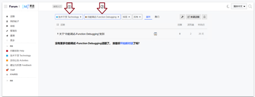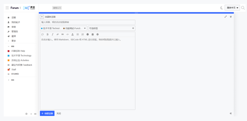 点击页面右上角新建话题进入发布帖子页面,首先填入标题并选择“技术干货 Technology→功能调试 Function Debugging”类别,也可根据帖子内容选择对应标签,将正文内容编辑完毕点击“创建话题”即可完成发帖!!!