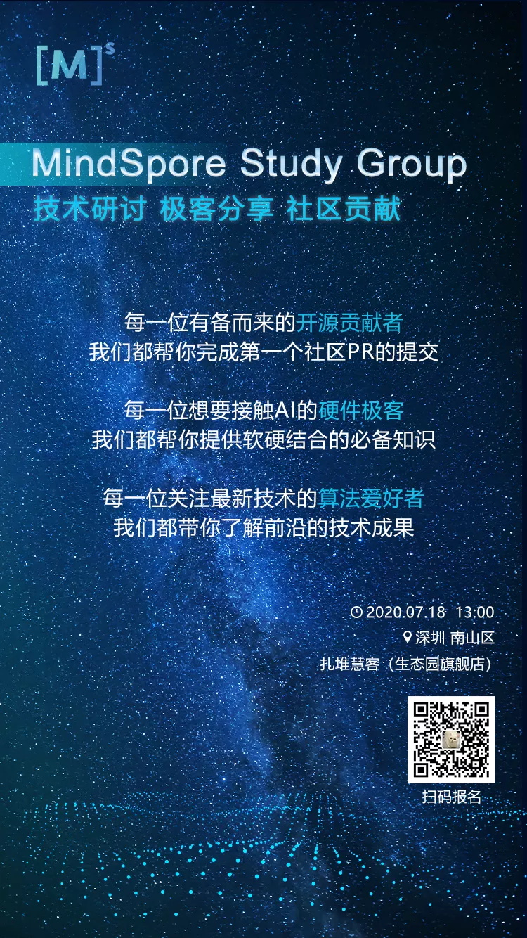 本周六,2020.7.18,首场MSG活动·深圳场来袭。我们会分享MindSpore的最新技术进展,前沿技术领域的实践,并且会邀请开发者们来分享技术实践~感兴趣的小伙伴快来报名吧!