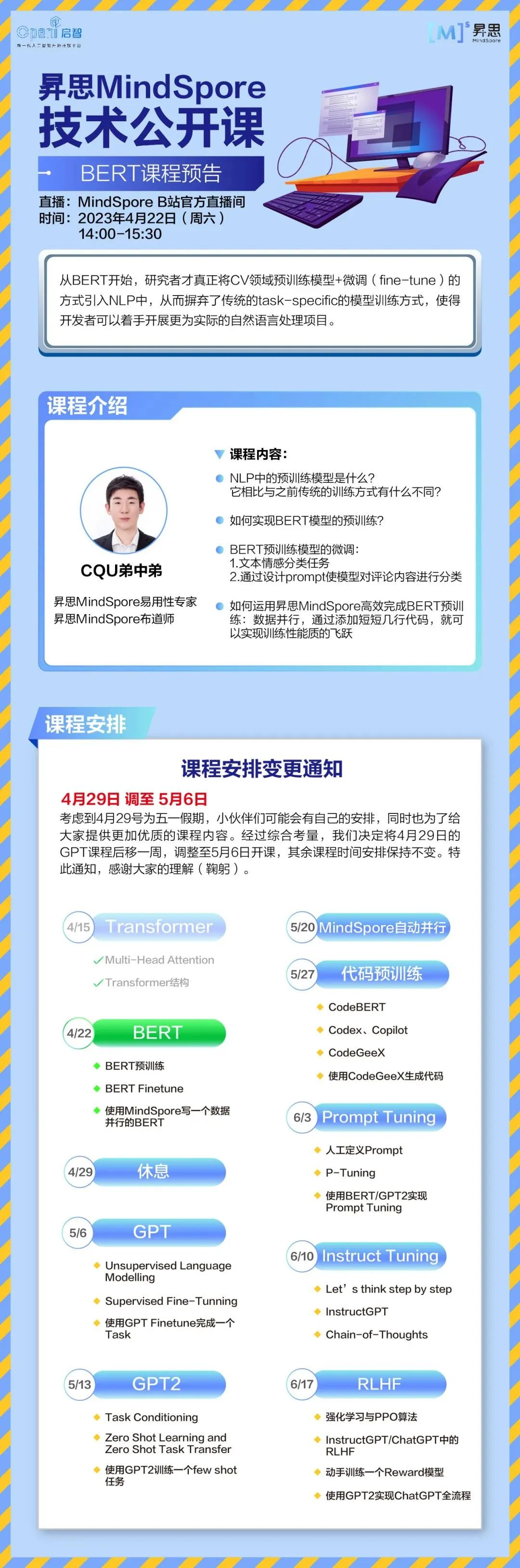 昇思MindSpore技术公开课·BERT课程明日开讲!周六下午14点锁定B站直播间【MindSpore官方】,昇思MindSpore易用性专家为你答疑解惑。