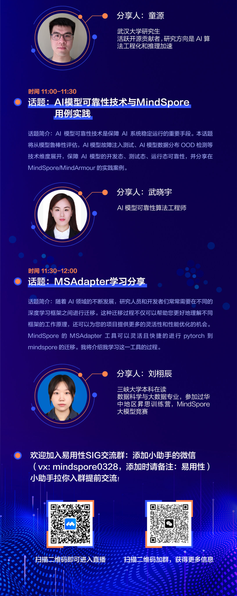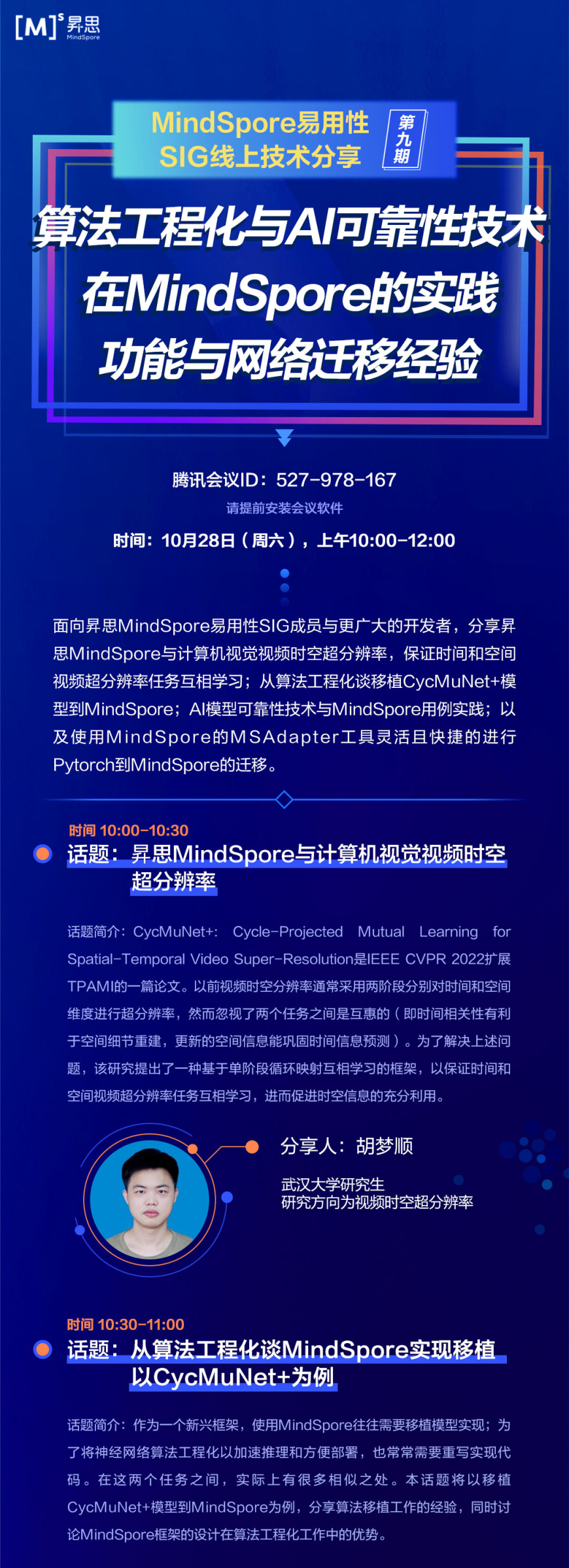 昇思MindSpore易用性SIG 技术分享会来啦!本周六(10月28日)开展以“算法工程化与AI可靠性技术在昇思MindSpore 的实践功能与网络迁移经验”为议题的技术分享会,4位开发者为大家带来昇思MindSpore的开发实践心得体会与经验分享,参与技术分享每一期都干货满满!技术分享会通过腾讯会议和昇思【MindSpore官方】B站直播间直播,敬请期待!