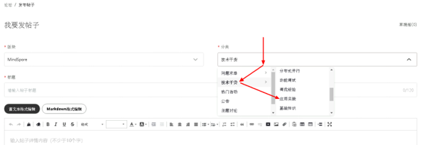 3.进入帖子编辑页面,首先请点击分类框并选择,然后再编辑标题和帖子详情内容,完成编辑后点击“发布帖子”即可。