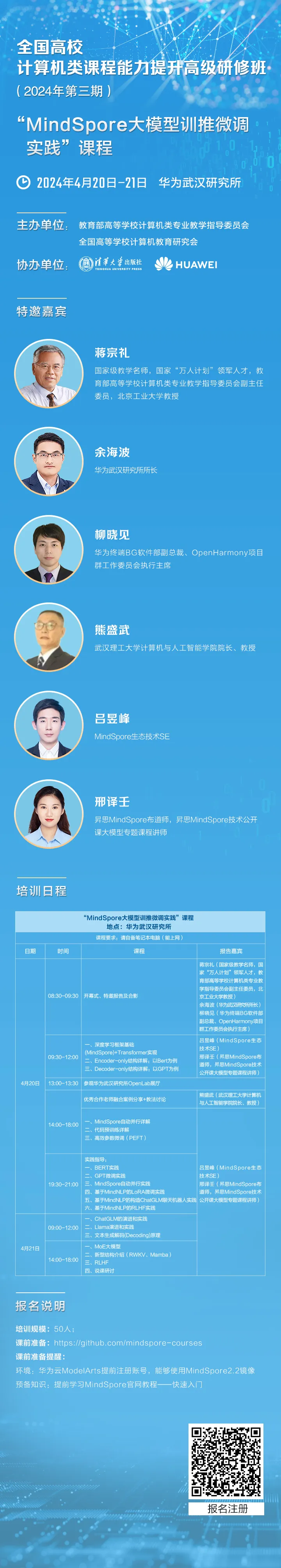 全国高校计算机类课程能力提升高级研修班第三期“MindSpore大模型训推微调实践”课程,将于4月20日-4月21日在华为武汉研究所开课。两位资深教授参与课程教研工作严把教学质量关,国家级教学名师、国家“万人计划”领军人才,教育部高等学校计算机类专业教学指导委员会副主任委员,北京工业大学蒋宗礼教授;武汉理工大学计算机与人工智能学院院长熊盛武教授,深耕人工智能领域多年,曾承担主持863计划、国家重点研发计划、国防基础研究和国家自然科学基金等项目的研究。本期课程内容由浅入深全面讲解昇思MindSpore自动并行理论与实践,详解ChatGLM与MoE大模型并通过实际场景运用进行展示。(课前准备:https://github.com/mindspore-courses)