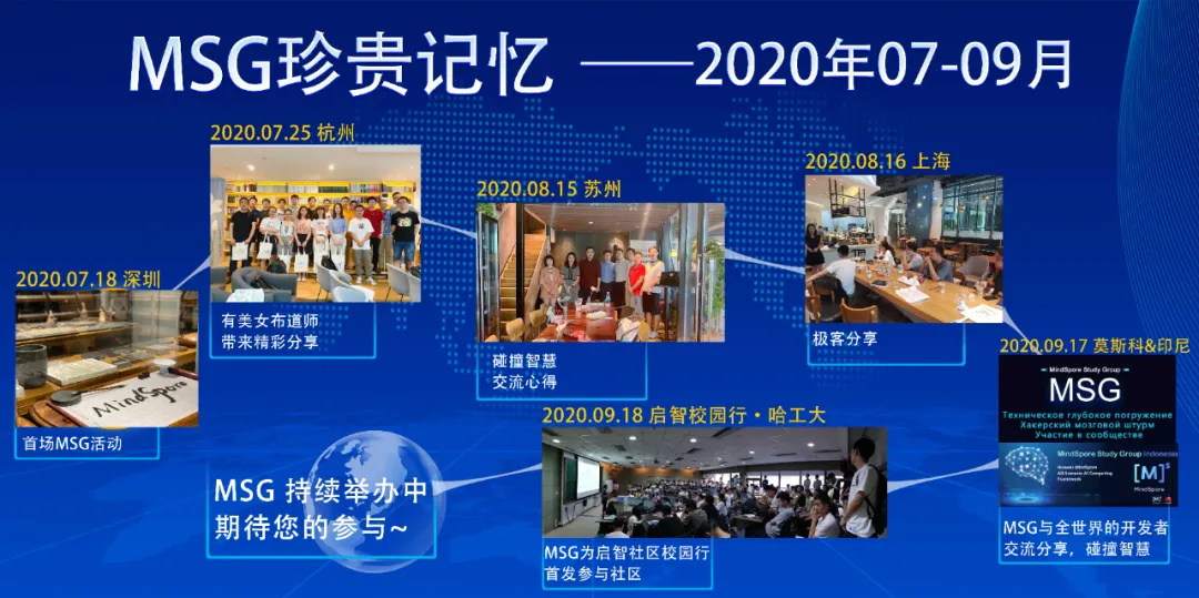 自2020年5月MSG组织成立开始,我们在海内外举办了数十场活动。国内已经在深圳、杭州、上海、苏州根据地,海外有俄罗斯、新加坡、印尼大本营,每次举办完后小伙伴们都意犹未尽,我们也收到了来自各地开发者的广大呼声,希望早日在他们的城市也建立MindSpore根据地。