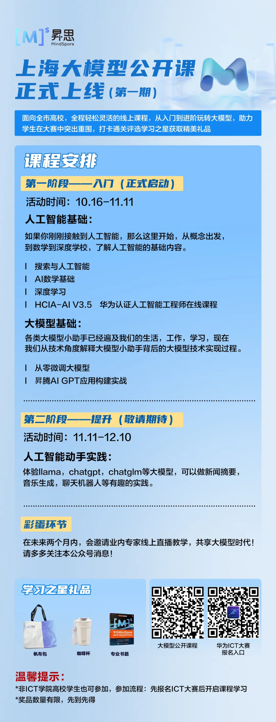 面向全市高校,全程轻松灵活的线上课程,从入门到进阶玩转大模型,助力学生在大赛中突出重围,打卡通关评选学习之星获取精美礼品,更有动手实践算力支持惊喜彩蛋等你揭晓!