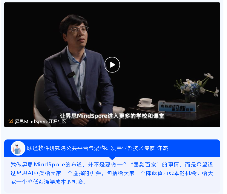 从2023年开始,就围绕昇思MindSpore开展教学研究,与社区合作开展了大模型创新训练营。MindSpore在数据预处理、模型训练和推理性能上有很多优势,对计算设备的支持也比较好,因此选择了昇思MindSpore。后续将开展师资培训,推广课程建设成果,让昇思MindSpore进入更多的学校和课堂。