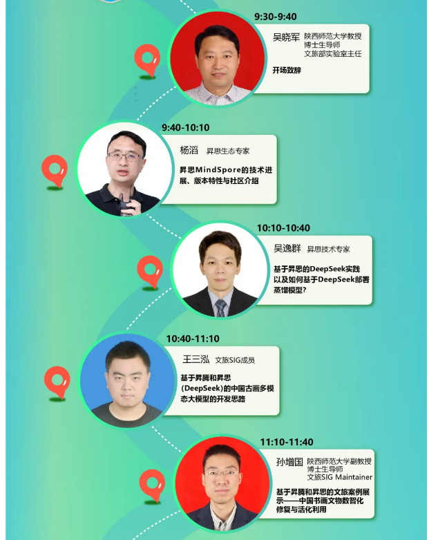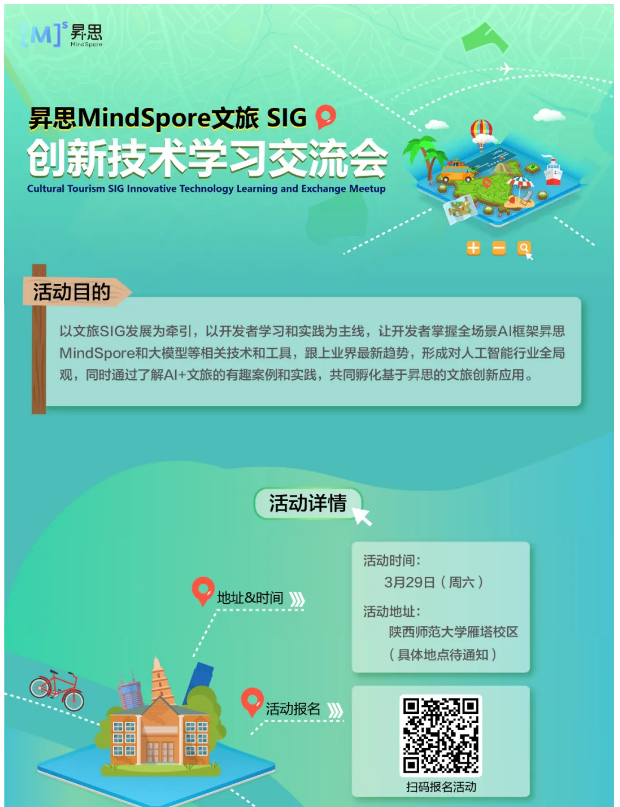 围绕昇思Mindspore和文旅主题,MindSpore Cultural Tourism SIG(文旅SIG)与民歌智能计算与服务技术文旅部重点实验室将于3月29日在陕西师范大学雁塔校区举办**《昇思文旅SIG创新技术学习交流会》**。本次会议面向所有对AI文旅感兴趣的你,希望通过学习昇思MindSpore的最新技术路线与基于昇思的DeepSeek实践,学习AI文旅的有趣案例与实践,共同孵化基于昇思的文旅创新应用。