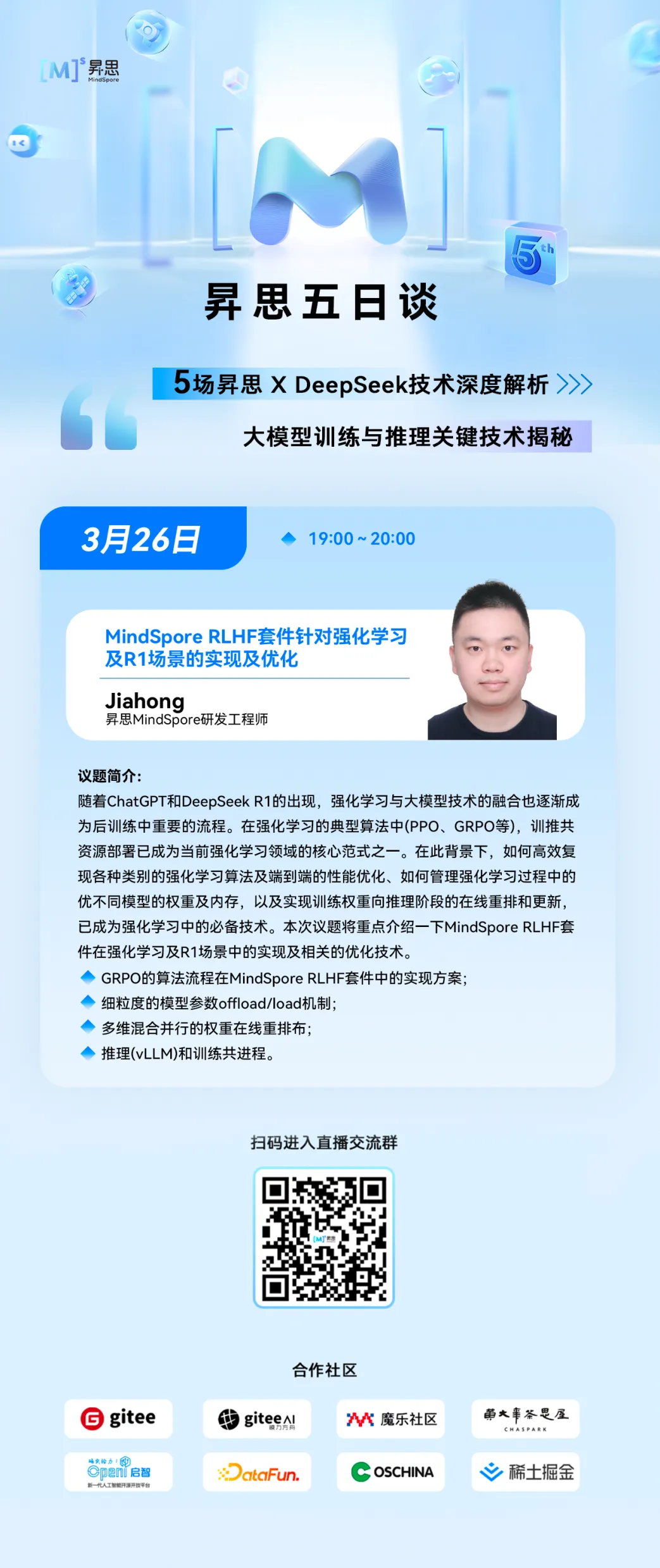 昇思五日谈·直播 | MindSpore RLHF套件针对强化学习及R1场景的实现及优化