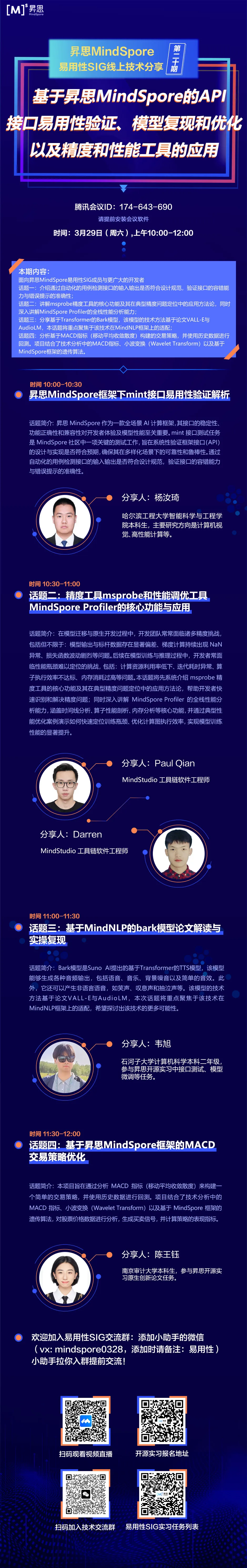 3月29日(本周六)上午10点,昇思MindSpore易用性SIG技术分享会等你参加!5位开发者带你看昇思MindSpore技术干货。话题一介绍通过自动化的用例检测接口的输入输出是否符合设计规范,验证接口的容错能力与错误提示的准确性;话题二讲解msprobe精度工具的核心功能及其在典型精度问题定位中的应用方法论,同时深入讲解MindSpore Profiler的全栈性能分析能力;话题三分享基于Transformer的Bark模型,该模型的技术方法基于论文VALL-E与AudioLM,本话题将重点聚焦于该技术在MindNLP框架上的适配;话题四分析基于MACD指标(移动平均收敛散度)构建的交易策略,并使用历史数据进行回测。