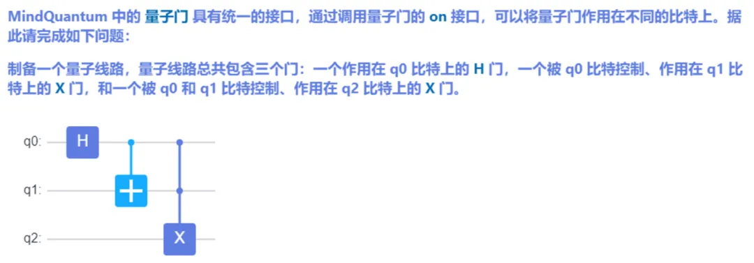 3)对于作用在q2上、受q0和q1控制的X门,目标比特是2,控制比特是0和1。当有多个控制比特时,需要将它们的索引放在一个列表里作为on方法的第二个参数,所以使用 X.on(2, [0, 1])。
