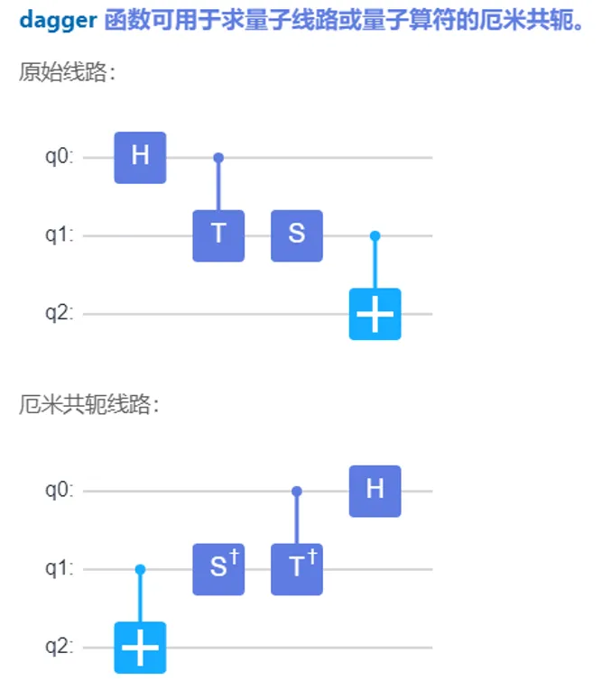 该函数接受一个 Circuit 对象(或其他支持厄米共轭操作的对象,如算符)作为输入,并返回一个新的 Circuit 对象,该对象即为输入线路的厄米共轭线路。它会自动处理门顺序的反转和每个门自身的厄米共轭替换。