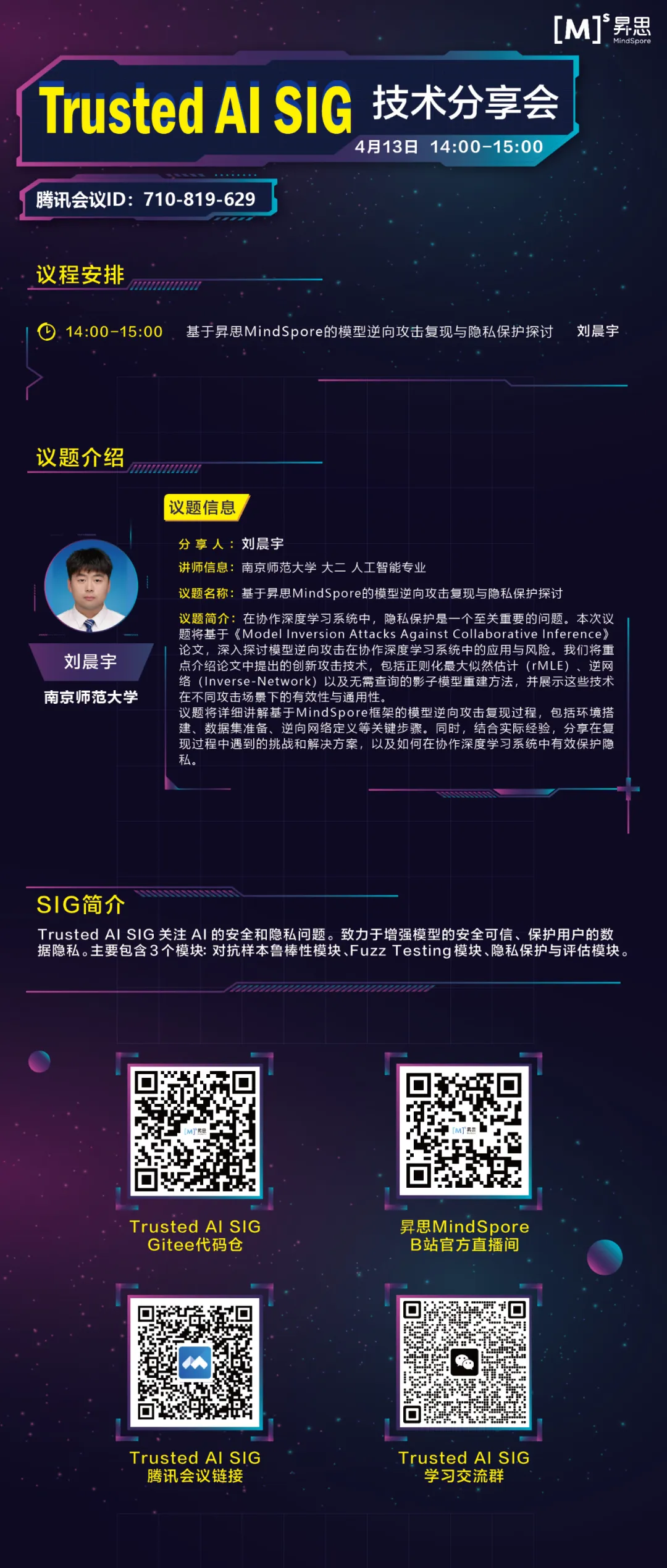 4月13日(本周日)14点,昇思MindSpore Trusted AI SIG邀你来参加!本期我们将聚焦模型逆向共计复现与隐私保护,基于《Model Inversion Attacks Against Collaborative Inference》论文,深入探讨模型逆向攻击在协作深度学习系统中的应用与风险,就论文中提出的新技术进行介绍和演示,对rMLE、Inverse-Network和无需查询的影子模型重建方法,并展示这些技术在不同攻击场景下的有效性与通用性。