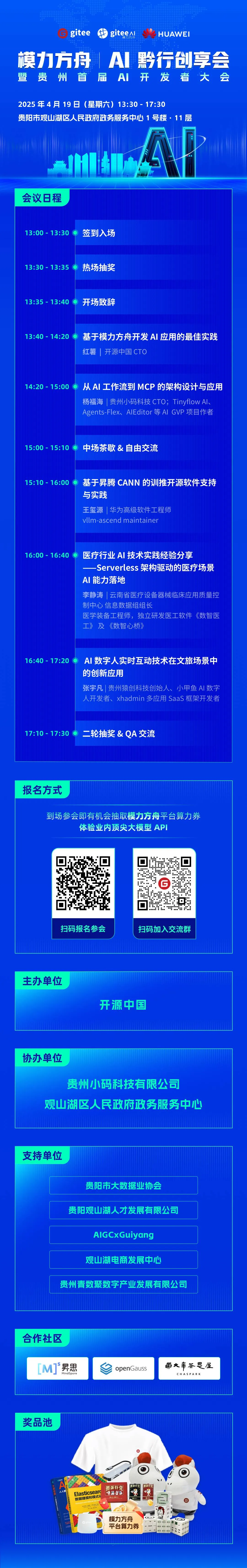 由开源中国主办的**「模力方舟 | AI 黔行创享会」**将于4月19日在贵州贵阳市盛大开幕!作为贵州首个聚焦AI技术开发与产业落地的专业盛会,本次大会特邀开源中国CTO 红薯;华为高级软件工程师 王玺源;贵州小码科技CTO、AI GVP项目开发者 杨福海;医学装备专家 李静涛等业界大咖,齐聚贵阳,共同探讨AI前沿技术!