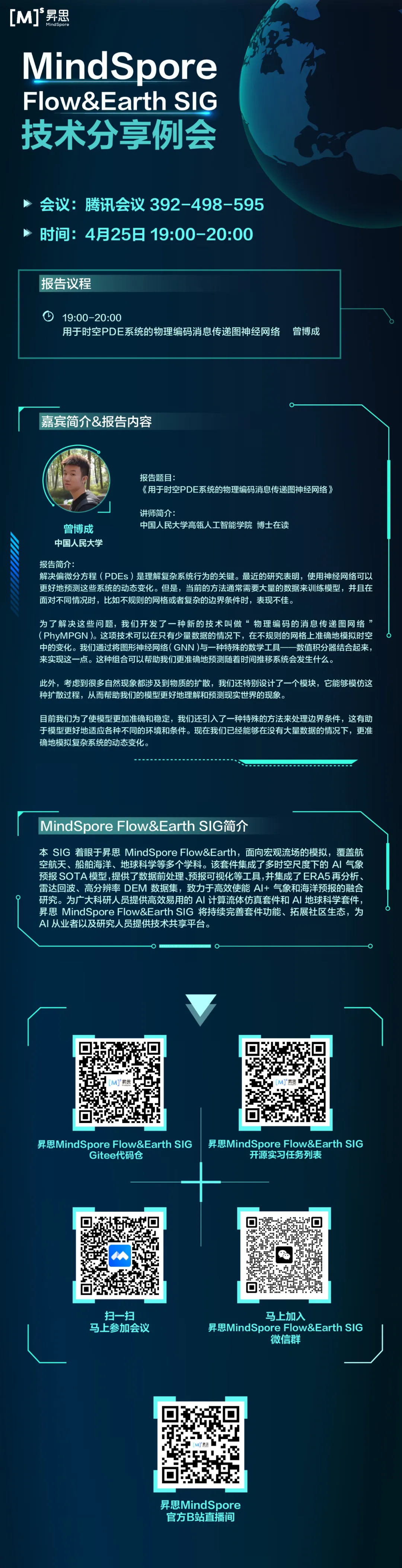 4月25日19:00,昇思MindSpore Flow&Earth SIG技术分享会启动!本期我们特邀 中国人民大学 曾博成老师 为大家讲解《用于时空PDE系统的物理编码消息传递图神经网络》。
