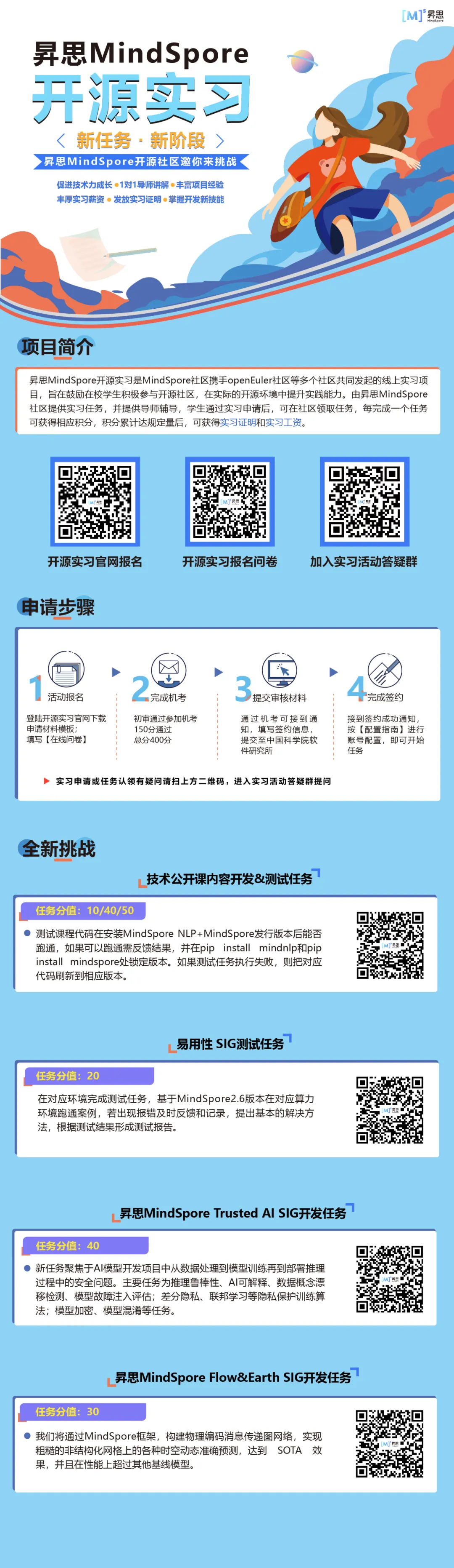 昇思MindSpore开源实习活动新任务来啦!本次同步发出20多个新任务,任务类型多样总有你的拿手项目!喊上你的同学与室友一同报名吧!