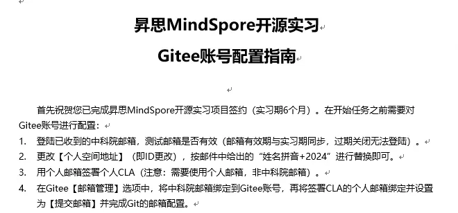 A: 审核流程需要4-5个工作日,如银行卡、学籍等信息无误即可收到签约邮件,将下发账号和中科院邮箱,请按照邮件里的【账号配置指南】文档进行Gitee账号配置。