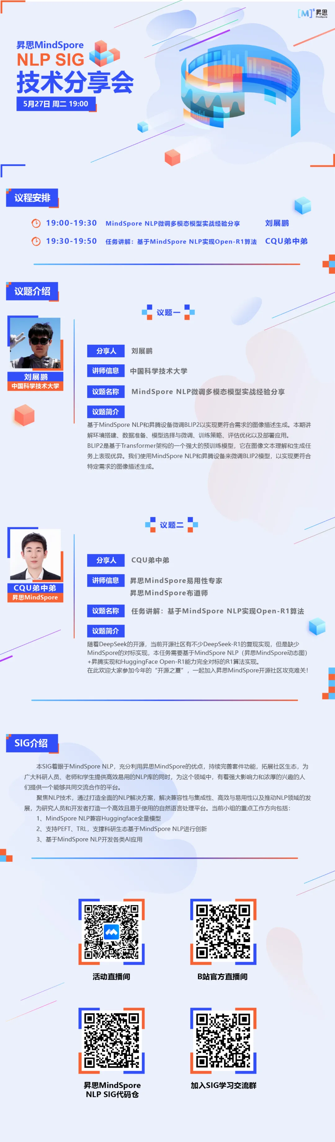 明晚19:00,昇思MindSpore NLP SIG与你相约昇思MindSpore B站官方直播间。本期技术分享会分为以下两个议题,精彩不容错过!