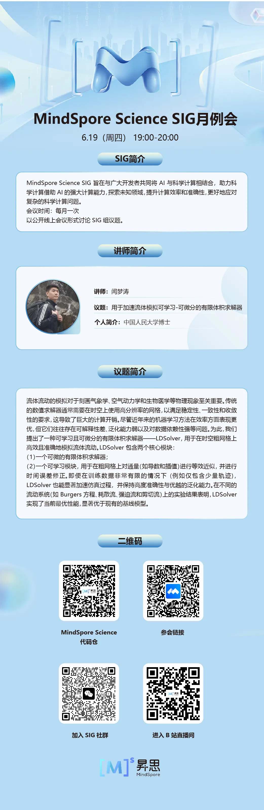 本期我们邀请到来自中国人民大学高瓴人工智能学院的闫梦涛博士为大家作议题报告,围绕议题《用于加速流体模拟可学习-可微分的有限体积求解器》探讨流体流动模拟对于刻画气象学、空气动力学和生物医学等物理现象的重要性。我们将了解该研究团队提出的可学习且可微分的有限体积求解器——LDSolver。各位敬请期待!请锁定我们当晚的B站直播间,同时也欢迎大家来腾讯会议一同线上交流~