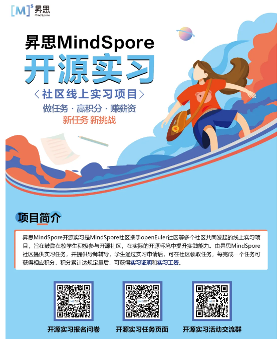 昇思MindSpore开源实习活动任务持续更新中!更多开发任务即将上线,敬请期待!报名请看海报,如由疑问可加入我们的实习答疑群,有活动专属小助手为你解答昇思MindSpore开源实习的各项问题,欢迎加入一起共建昇思MindSpore社区。