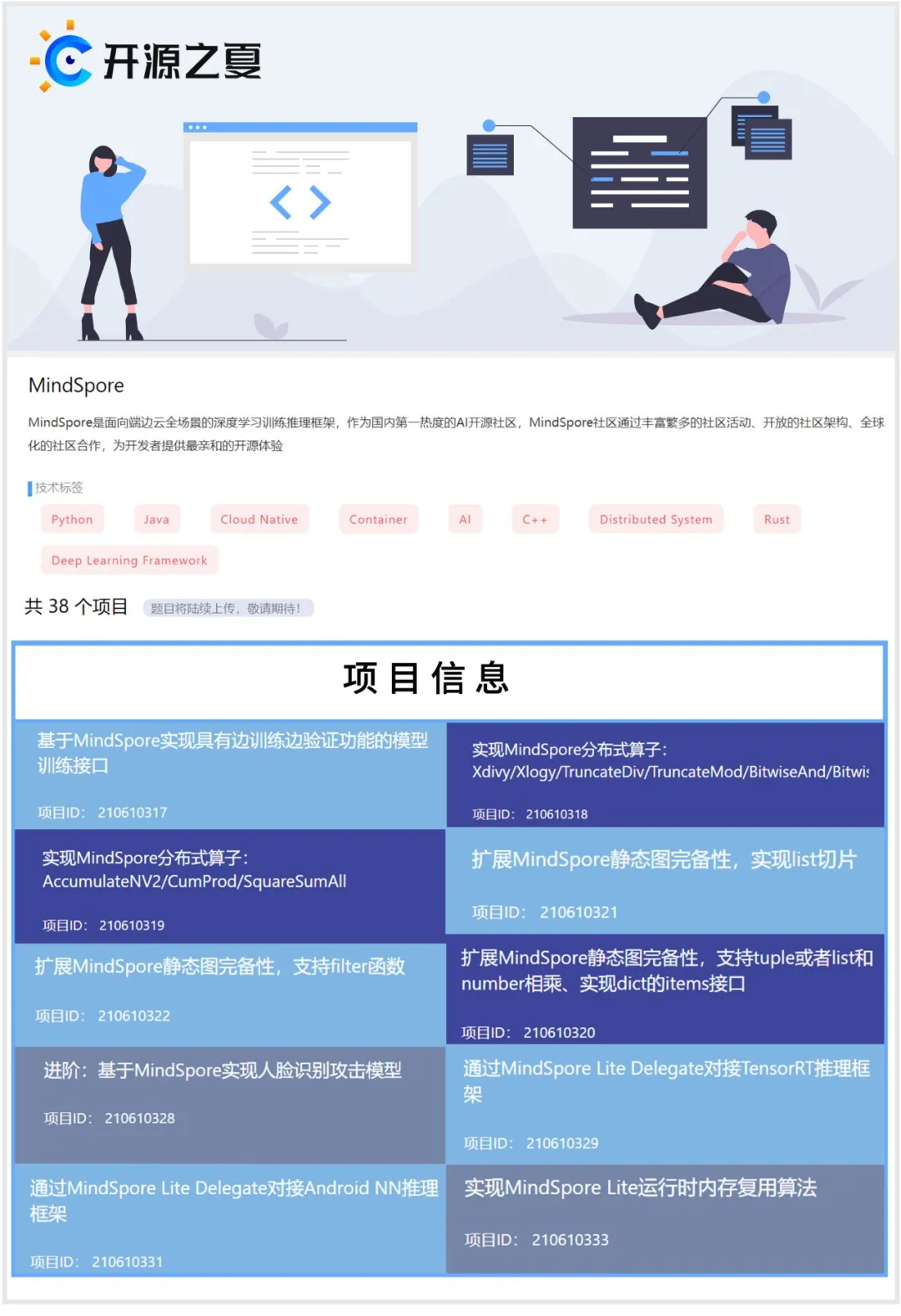 MindSpore 在暑期2021官网上发布了38个项目,更多信息通过下方链接跳转官网了解。