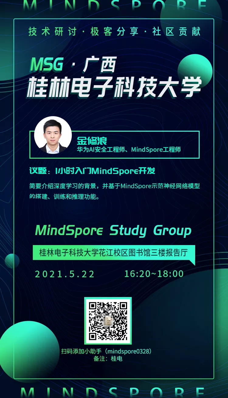 本周六(5月22日),MSG·广西我们将邀请华为AI安全工程师、华为自研AI计算框架MindSpore团队成员——金修浪,与大家面对面的交流与分享深度学习的背景,并一同探讨神经网络和MindSpore,让大家有初步的理解和掌握!
